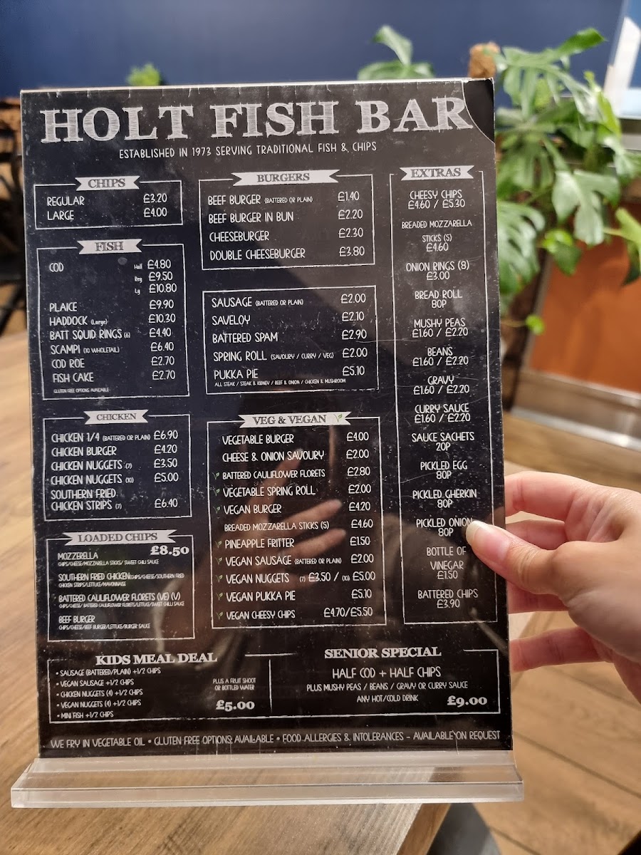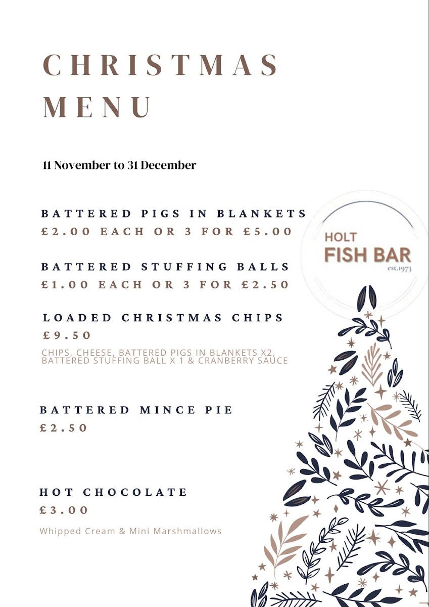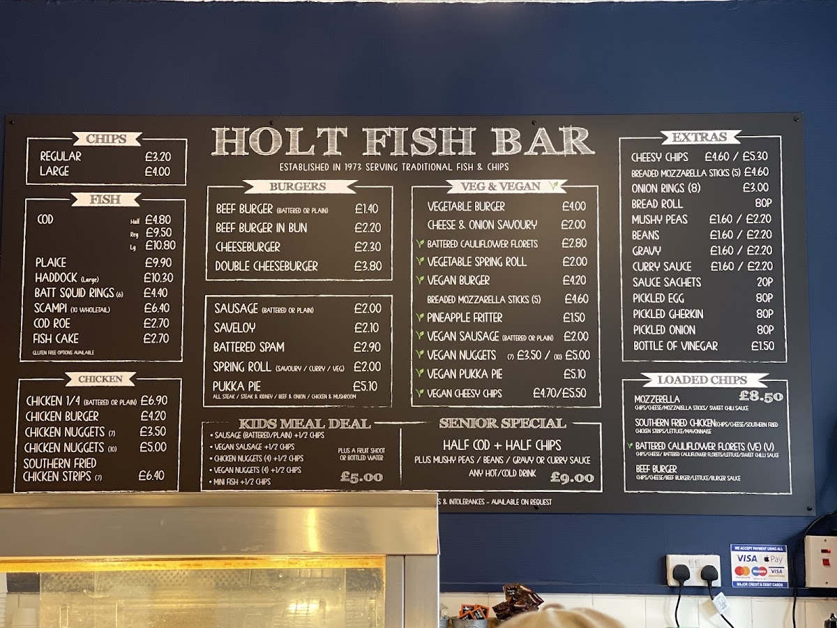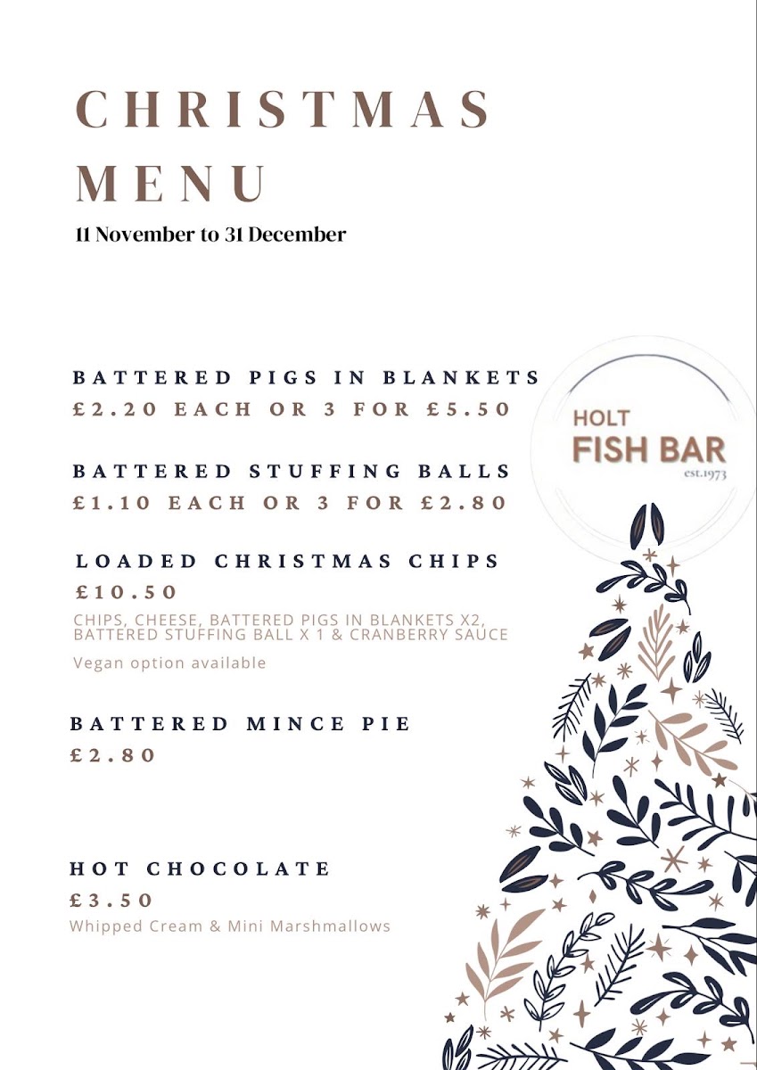 The menu at Holt Fish Bar offers a variety of dishes, catering to all tastes and preferences. For those craving a classic, Beef Burger (£4.00) or Cheeseburger (£4.50) are popular choices, while the Double Cheeseburger (£5.00) is perfect for a heartier meal. If you’re in the mood for something extra, there are options like Cheesy Chips (£2.50), Onion Rings (£2.00), and Mushy Peas (£1.00). For vegetarians and vegans, the Vegetable Burger (£3.50) and Vegan Burger (£4.00) stand out, alongside tasty Battered Cauliflower Florets (£3.00). The fish selection is extensive, with Cod (£6.50), Plaice (£6.00), and Haddock (£6.00), complemented by Scampi (£4.50) and Squid Rings (£4.00). Chicken lovers can enjoy Chicken Nuggets (4 pieces, £3.00) or a Chicken Burger (£4.00). If you're after a loaded treat, the Mozzarella Loaded Chips (£4.00) or Southern Fried Chicken Loaded Chips (£5.00) are great choices. There’s a special Kids Meal Deal, which includes Chicken Nuggets (4 pieces) and half chips (£3.50). To wash it all down, sip on an Americano (£2.00) or a refreshing can from the Cold Drinks Bar (£1.00). For dessert, try the indulgent Battered Chocolate Bar (£2.00) or explore the festive Christmas Menu, featuring treats like Battered Pigs In Blankets (£3.50) and Battered Mince Pie (£3.00). Whether you're in for a quick bite or a full meal, the Holt Fish Bar offers something for everyone, with flavors that satisfy a variety of cravings.