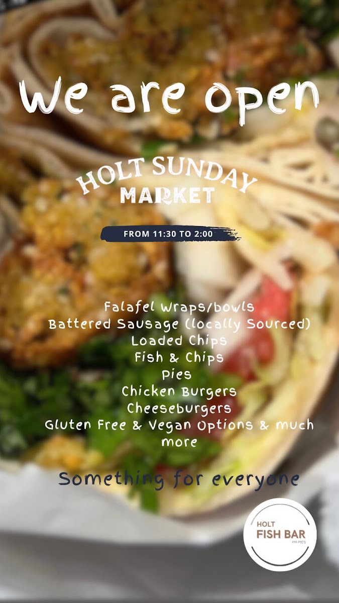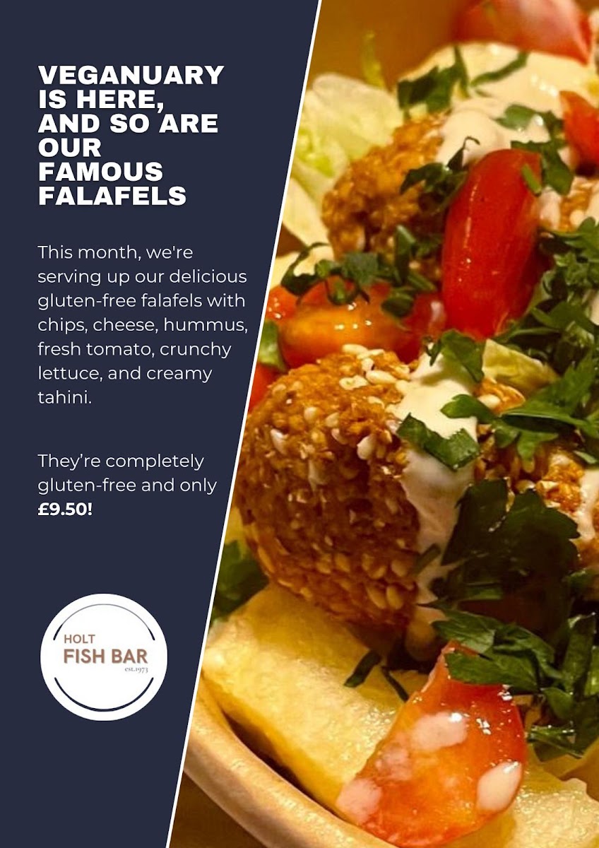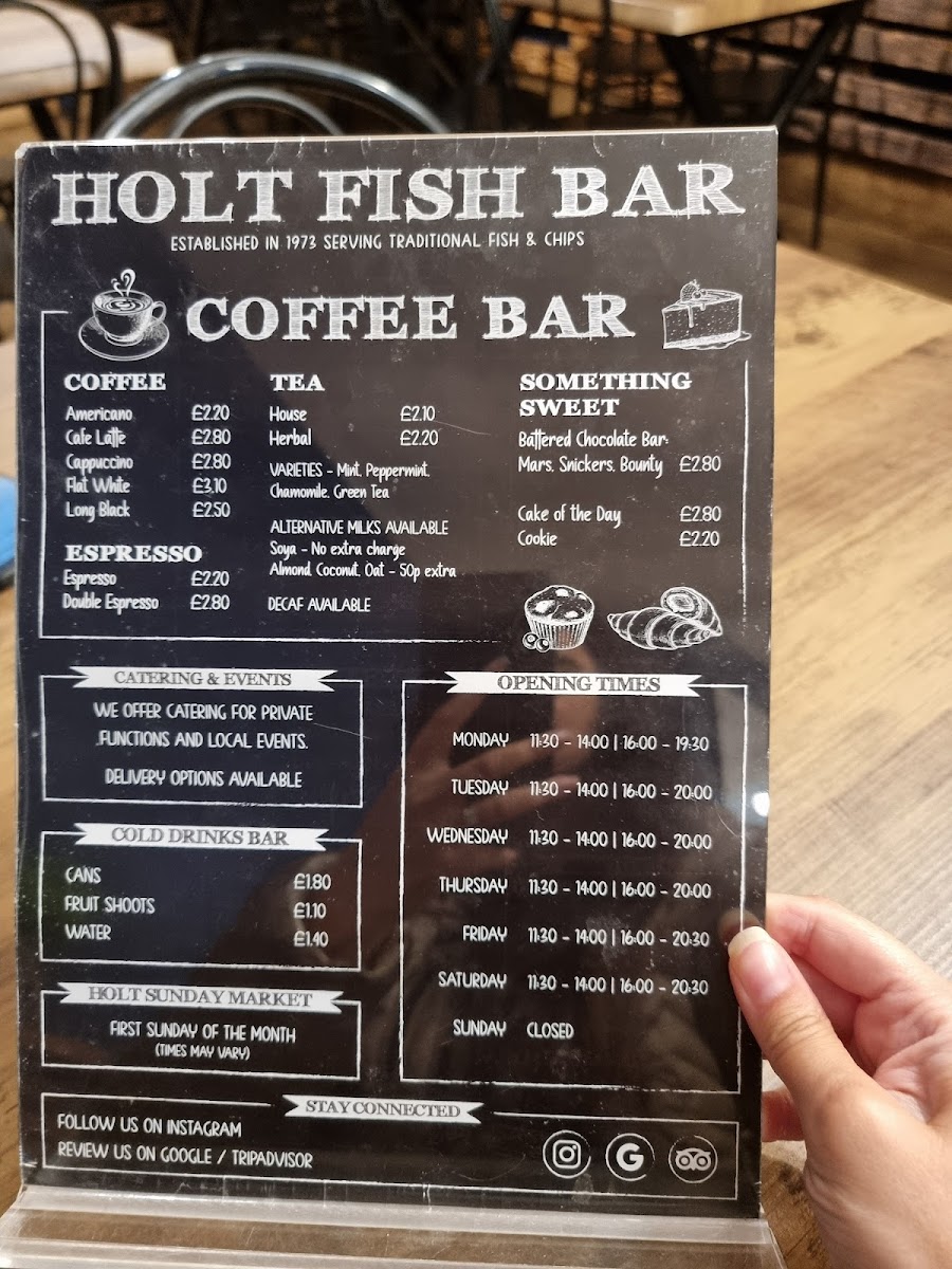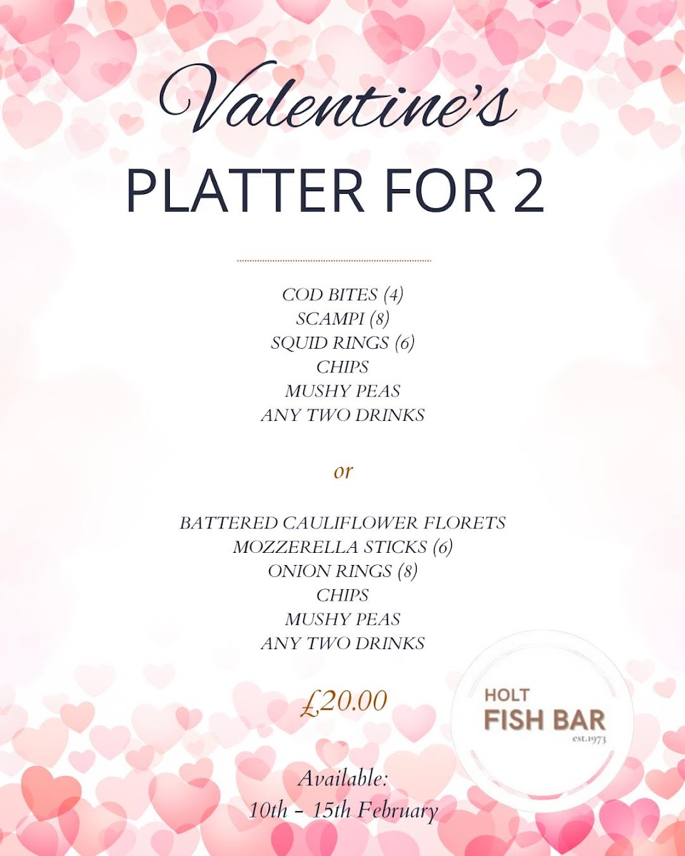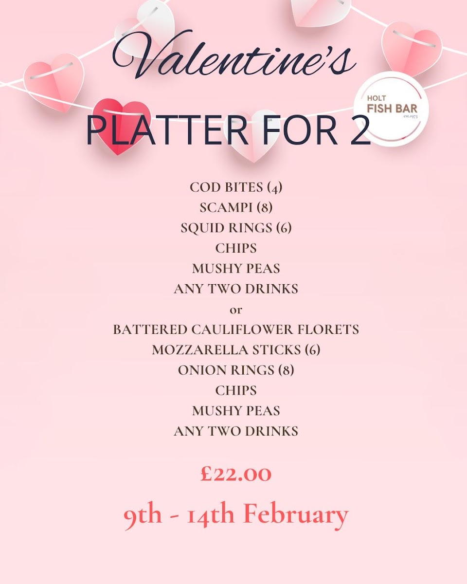 The menu at Holt Fish Bar offers a variety of dishes, catering to all tastes and preferences. For those craving a classic, Beef Burger (£4.00) or Cheeseburger (£4.50) are popular choices, while the Double Cheeseburger (£5.00) is perfect for a heartier meal. If you’re in the mood for something extra, there are options like Cheesy Chips (£2.50), Onion Rings (£2.00), and Mushy Peas (£1.00). For vegetarians and vegans, the Vegetable Burger (£3.50) and Vegan Burger (£4.00) stand out, alongside tasty Battered Cauliflower Florets (£3.00). The fish selection is extensive, with Cod (£6.50), Plaice (£6.00), and Haddock (£6.00), complemented by Scampi (£4.50) and Squid Rings (£4.00). Chicken lovers can enjoy Chicken Nuggets (4 pieces, £3.00) or a Chicken Burger (£4.00). If you're after a loaded treat, the Mozzarella Loaded Chips (£4.00) or Southern Fried Chicken Loaded Chips (£5.00) are great choices. There’s a special Kids Meal Deal, which includes Chicken Nuggets (4 pieces) and half chips (£3.50). To wash it all down, sip on an Americano (£2.00) or a refreshing can from the Cold Drinks Bar (£1.00). For dessert, try the indulgent Battered Chocolate Bar (£2.00) or explore the festive Christmas Menu, featuring treats like Battered Pigs In Blankets (£3.50) and Battered Mince Pie (£3.00). Whether you're in for a quick bite or a full meal, the Holt Fish Bar offers something for everyone, with flavors that satisfy a variety of cravings.